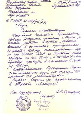 23. Письмо Севостьяновой Т.Н.(11.07.95), справки о реабилитации Гонтарева (30.09.57) (4 листа)