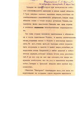 61. Текст выступления Н.В. Севрюгина на церемонии открытия памятника жертвам политических репрессий в Туле 30.10.1995 (3 листа)