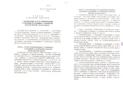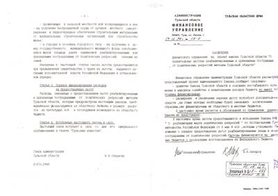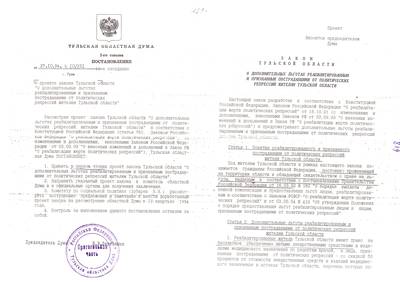 39. Постановление № 10/231 от 27.10.94 о проекте закона Тульской области "О дополнительных льготах реабилитированным и признанным пострадавшими от политических репрессий жителям Тульской области" с приложением проекта закона и Заключением финуправления № 12-7 от 14.12.94 (5 листов)