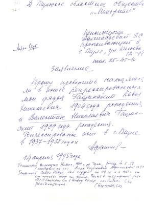 12. Заявление Афанасьевой А..С., справки о реабилитации Гащинского В.Н. и Гащинского П.Н. (4 листа)