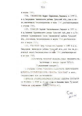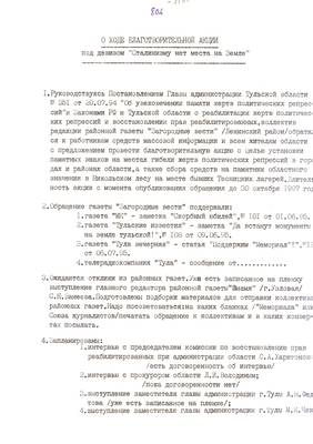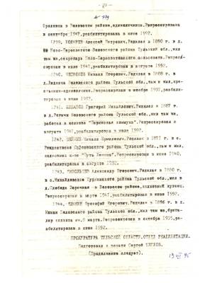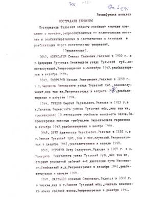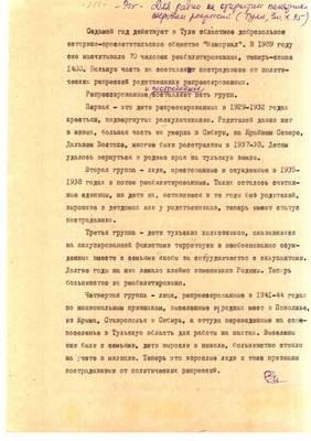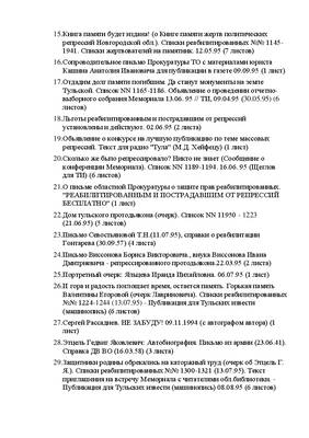 40. Сгинула моя крестная на за что ни про что (очерк о Стюхиной М.М.). Списки реабилитированных №№ 1322-1350 (13.07.95). Текст приглашения на встречу Мемориала с читателями обл.библиотеки. - Публикация для Тульских извести (машинопись 30.08.95). Опубл. 05.09.95 (6 листов)