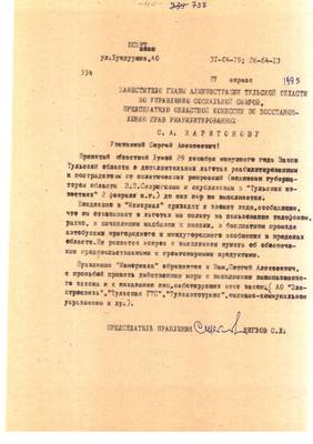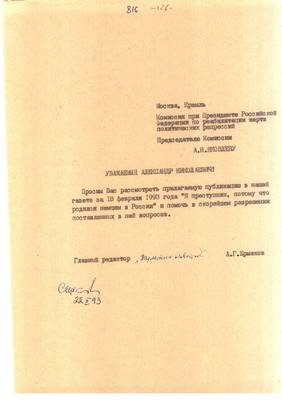 37. Письмо главного редактора "Тульских Известий" А.Г. Ермакова председателю Комиссии при Президенте РФ по реабилитации жертв политических репрессий А.Н. Яковлеву с приложением публикации от 18.02.1993 г. о судьбе российских немцев. (1 лист)