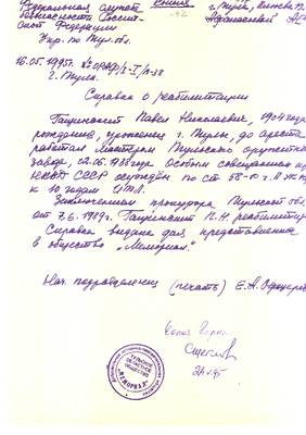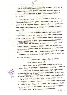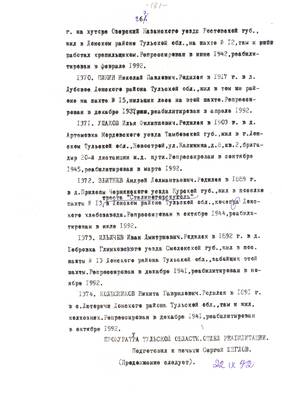 3. Очерк о репресс. жителе г. Суворова Решетове Ив.Ив. (без начала). Списки репрессированных с N 973 -997 // Тульские известия, 1994 - 30 янв. (машинопись)