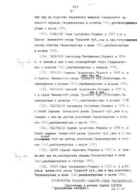 На днях в Туле под председательством С.А. Харитонова, заместителя главы администрации Тульской области, состоялось очередное заседание комиссии по восстановлению прав реабилитированных. Было рассмотрено четырнадцать ходатайств наследников раскулаченных семей: Никиты Арбузова (1930 г., д. Хомутовка тогдашнего Михайловского района), Никиты Базеева (1930 г., д. Поганцево Тепло-Огарёвского района), Григория Малыхина (д. Перевесово Ефремовского района), Ивана Собаченкова (1931 г., д. Ялта Воловского района), Фёдора Глашкина (1931 г., д. Графская Тепло-Огарёвского района), Трофима Кочеткова (1931 г., д. Вицынские Выселки Ефремовского района), Василия Минаева (1931 г., с. Митино Заокского района). А также репрессированных: Михаила Малинина (1937 г., д. Клоково нынешнего Ленинского района), Петра Дегтярёва (1938 г., Тула), Александра Ананьева (1936 г., Тула), Евдокии Николаевой (1942 г., д. Хопилово,. Ленинского района), Марии Воронкиной (1942 г., пос. Ханино Суворовского района), Матрёны Аносовой (1943 г., Черепетский район), Ивана Скуднова (1944 г., с. Большие Городенцы Венёвского района).