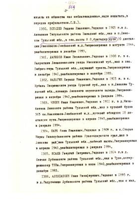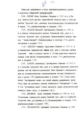 Более 1200 жителей области являются сегодня членами Тульского добровольного историко-просветительского обще ства "Мемориал". Это репрессированные в прошлом по политическим мотивам и впоследствии реабилитированные, а так- же их ближайшие родственники, отнесенные по нынешнему наков законодательству к пострадавшим от политических репрессий. Есть в обществе и люди, не подвергавшиеся репрессиям и не пострадавшие от них, но сочувствующие целям общества и же лающие помогать в их осуществлении. Реабилитированных в тульском "Мемориале" 530, пострадавших 870. Примерно две сотни и реабилитированные, и пострадавшие (родители их тоже были репрессированы и реабилитированы). Больше всего реабилитированных и пострадавших в областном центре, затем следуют Новомосковск, Щекино, Киреевск и другие города и районы.