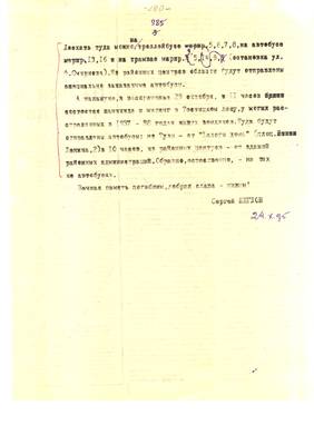 55. Текст объявление об открытии Памятника в Туле (30.10.95) и приглашение на траурные мероприятия в Тесницком (29.10.95). Подготовительные материалы С. Щеглова для Тульское радио - (М.Д. Хейфец) 26.10.95) (1 лист)