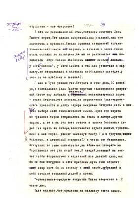 51. Специальный выпуск информационного бюллетеня общества Мемориал - "30 октября", к 20-летию объявления Дня памяти жертв полит репрессий ( с пометками С.Л. Щеглова) . Без даты -(2001)? (4 листа)