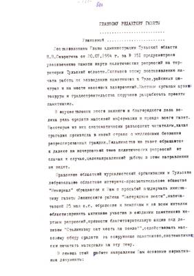 30. Обращение к главным редакторам областных и районных газет от Тульской журналисткой организации и Мемориала (проект). Список нормативных документов об увековечивании памяти. 11.08.95 (3 листа)