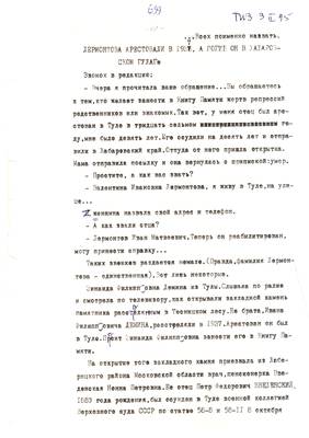 5. Лермонтова арестовали в 1937, а погиб он в Хабаровском Гупаге. Списки репрессированных с N 1016 - 1041. Списки жертвователей на памятник // Публикации (машинопись) С. Щеглова для газеты Тульские известия. 03.02.1995. (6 листов)