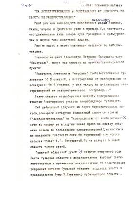 56. Текст обращения полномочного представителя президента России в Тульской обл. В. Кузнецова. Подготовлено С. Щегловым 17.10.95. (1 лист)