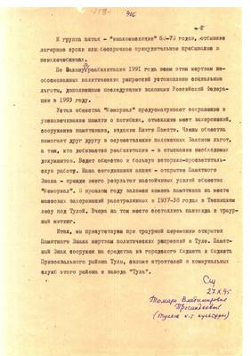 Для того, чтобы установить монументы в районных центрах, хотя в первую очередь в Новомосковске, Шекине, Киреевске, Алексине, Ефремове, Узловой, Ясногорске, Белеве, Плав ске, Богородицке, Кимовске, Куркине, Суворове, надо создать там отделения "Мемориала". Такая цель поставлена. Пока что отделения есть в Новомосковске, Донском и Щекине. Причем, в Щекине отделение существует номинально, нет даже помещения, куда могли бы прийти нуждающиеся в консультации, надо ехать для этого в Тулу.