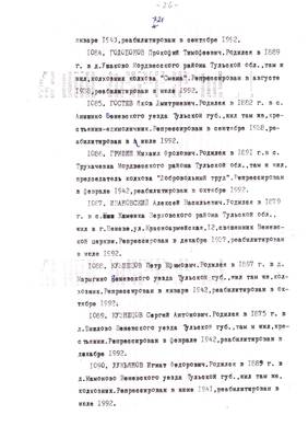 4. Пострадали безвинно. Списки репрессированных с N 998 - 1015 // Публикации (машинопись) С. Щеглова для газеты Тульские известия. 17.01.1995.