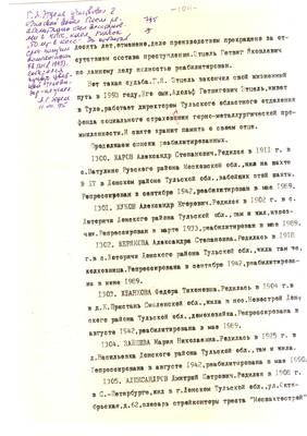 29. Защитники родины обрекались на каторжный труд (очерк об Этцель Г. Я.). Списки реабилитированных №№ 1300-1321 (13.07.95). Текст приглашения на встречу Мемориала с читателями обл.библиотеки. - Публикация для Тульских извести (машинопись) 08.08.95 (6 листов)