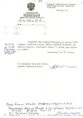 16. Сопроводительное письмо Прокуратуры ТО с материалами юриста Кашина Анатолия Ивановича для публикации в газете 09.09.95
