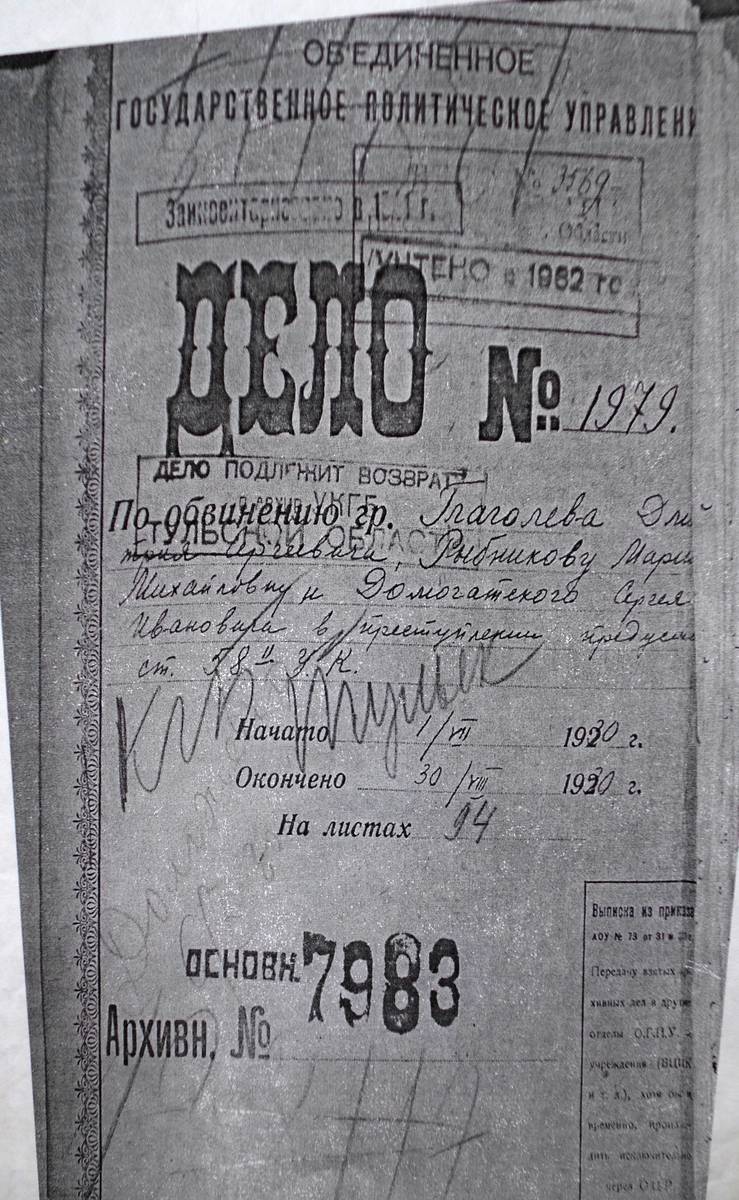 1. Обложка следственного дела № 1979 по обвинению Глаголева Дмитрия Сергеевича, Рыбниковой Марии Михайловны и Домогатского Сергея Ивановича в преступлении предусмотренном ст. 58-2 УК начатого 01.06.1930 - 30.07.1930.