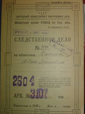 Где и кем арестован: Плавским РО УНКВД ТО (мл. лейтенант ГБ Карев, ст. л-т ГБ Путрин) Дата ареста: 30 октября 1937 г. Обвинение: антисоветская агитация Осуждение: 25 ноября 1937 г. Осудивший орган: тройка при УНКВД по Тульской обл Статья: 58-10 Приговор: 10 лет ИТЛ Место отбывания: Бурлаг, Читинская обл., ст.Большой Невер, п/о Тында, ДВК, Амурлаг НКВД СССР, 4 колонна, 1 отделение, • Амурская обл., ст. Тахтамыгда Амурской ж/д п/я 210, 1/3, портновская мастерская. Дата освобождения: 1 апреля 1944 г. Дата реабилитации: 16 июня 1990 г. Реабилитирующий орган: Тульская областная прокуратура