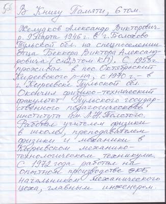 Желудков Александр Викторович. Родился 9 марта 1946 г. в г. Болохово Тульской обл, на спецпоселении отца Беккера Виктора Александровича (см. 2, 3 том КП). С 1953 г проживал в пос. Октябрьский Киреевского р-на, с 1940 г. – в.г. Киреевске Тульской обл. Окончил физико-технический факультет Тульского государственного педагогического института им. Л.Н. Толстого, Работал учителем физики в школе, преподавателем физики в Киреевском механико-технологическом техникуме. С 1972 года работал начальником механического цеха на опытном производстве ЭКБ, позже - главным инженером. С 1981 г. работал начальником участка на шахте Липковская, зам. начальника Киреевского машиностроительного производства. Вместе с женой воспитал сына и дочь, помогал в воспитании пятерых внуков. Реабилитирован 20.05.1996 г. С 2012 г. проживал в Туле. С 1996 г. - член Тульского областного историко-просветительского, благотворительного и правозащитного общества Мемориал. Умер 22 февраля 2016 г. в Туле.