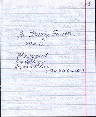 4. Черновик биограммы Желудкова А.В., подготовленной сестрой В.В. Дюковой для VI тома Книги памяти (рукопись)