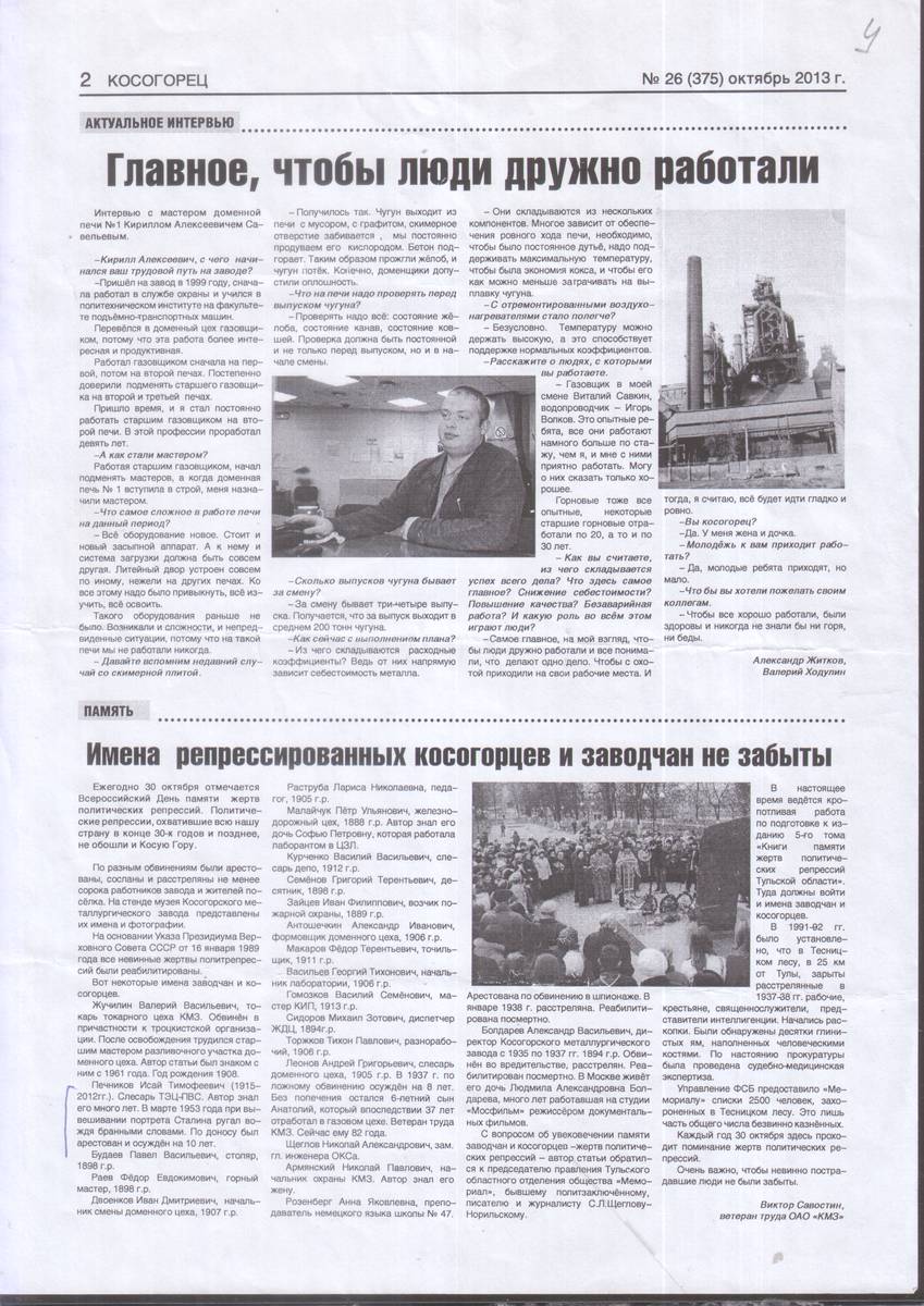 3. Савостин Виктор. Имена репрессированных косогорцев и заводчан не забыты // Косогорец. - 2013, октябрь. – № 26 (375). – С. 3