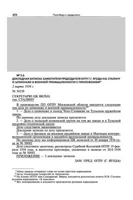 1. ДОКЛАДНАЯ ЗАПИСКА ЗАМЕСТИТЕЛЯ ПРЕДСЕДАТЕЛЯ ОГПУ Г.Г. ЯГОДЫ И.В. СТАЛИНУ О ШПИОНАЖЕ В ВОЕННОЙ ПРОМЫШЛЕННОСТИ С ПРИЛОЖЕНИЕМ. 2 марта 1934 г.