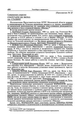 1. МАРШАЛ Ольдрих Эмануилович, 1906 г.р., урож. гор. Углечская Яно- вица в Чехо-Словакии, по происхождению сын чиновника, бывш. офицер — подпоручик чехо-словацкой армии, б/п, холост, чехо-словацкий подданный. До приезда в СССР работал в течение 6 лет у фирмы «Шкода». В СССР прибыл как иноспециалист по индивидуальному договору в 1931 г. и определен на Тульский оружейный з-д. На заводе занимал должность Начальника Машиностроительного Отдела. Арестован. Показаний не дает.