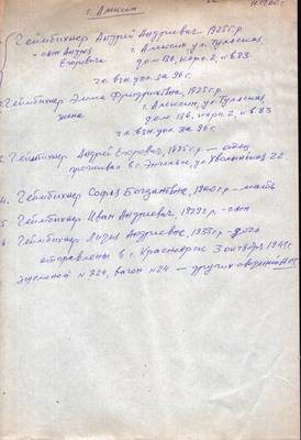 семьи Геймбихнер проживала в г. Энгель Саратовкой обл., в 1941 г. репрессирована по национальному признаку - немцы. Депортирована в г. Красноярск с эшелоном № 824, вагон 24