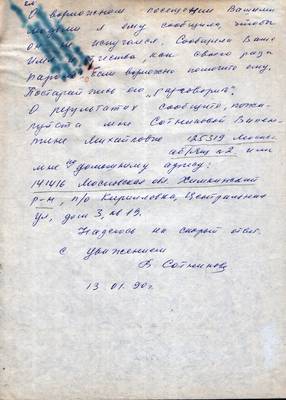 1. Письмо Сотниковой В.М. (Московский Мемориал) к Левину Г.И. (Тульский Мемориал) с просьбой взять интерьвью у Мосина С.Н. (Арсеньевский р-н).1990.