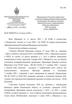 8. Справка УФСБ по Тульской области № К-966/2 от 26.08.2025 в отношении граждан: Баконина В. В., Балонкина Г. А., Безухова М. Ф., Блоха Л. И., Боровского В. А., Бумана Я. Я., Вайсбута И. М. и отсутствии информации о Богданове К. П. и Бредихине К. П.