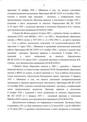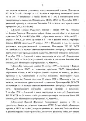 1. Баконин Василий Васильевич родился 27 июля 1898 г.р., уроженец г. Орёл, из рабочих, гражданин СССР, член ВКП(б) с 1926 г., образование среднее, в РККА не служил, до ареста проживал в г. Туле и работал заведующим коммунального отдела. Арестован 5 января 1938 г. Обвинялся в том, что являлся участником контрреволюционной организации. Приговором Военной коллегии Верховного Суда СССР (далее - ВК ВС СССР) от 7 октября 1938 г. осужден к высшей мере наказания - расстрелу, с конфискацией всего личного ему принадлежащего имущества. Приговор приведен в исполнение 7 октября 1938 г. (сведений о месте захоронения не имеется). Определением ВК ВС СССР от 08.02.1956 указанный приговор в отношении Баконина В.В. отменен, дело производством прекращено (архивное уголовное дело (далее - АУД) № П-6976).