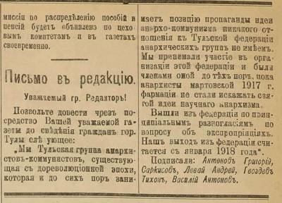 1. Письмо членов Тульской группы анархистов-коммунистов в редакцию газеты "Революционный вестник". 1918. - 18 апр.